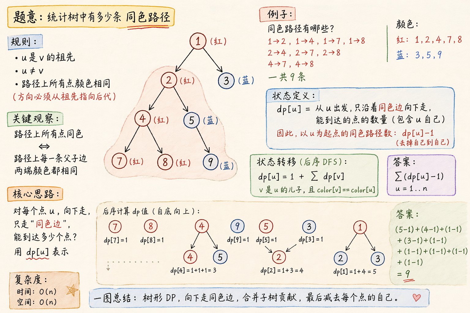 设 $dp_u$ 表示:从节点 $u$ 出发,只沿着“颜色相同”的父子边向下走,最多能够到达的节点数(包含 $u$ 自己)。