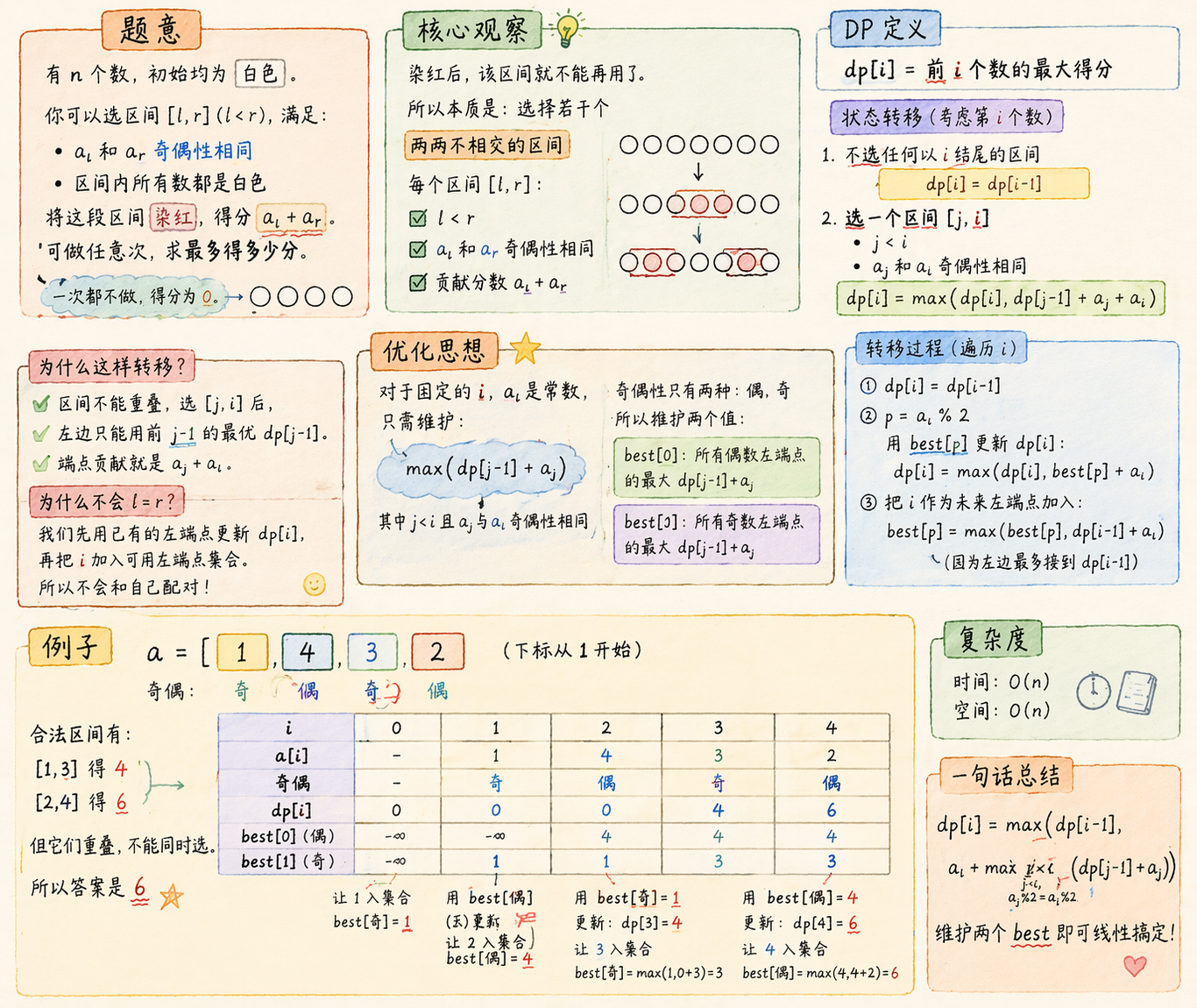 选择若干个 两两不相交 的区间,每个区间 $[l,r]$ 需要满足端点奇偶性相同,并贡献分数 $a_l+a_r$。