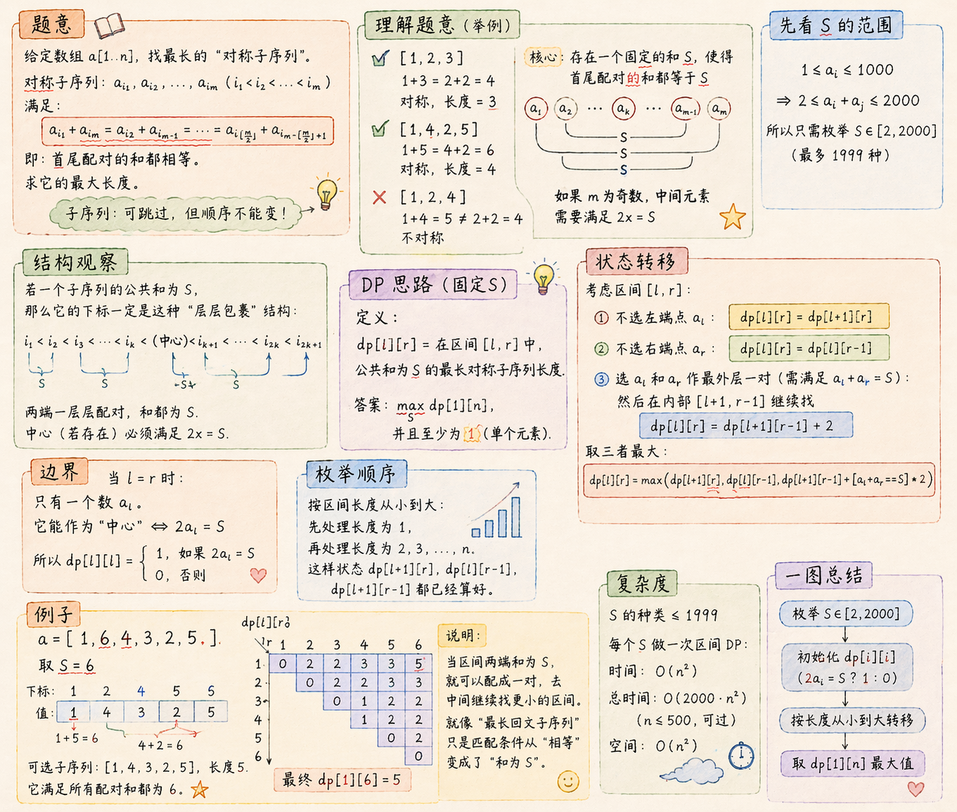- 如果最优解同时使用了左右端点,那么必须满足 $a_l+a_r=S$,并且内部部分也必须继续构成同样公共和为 $S$ 的对称子序列